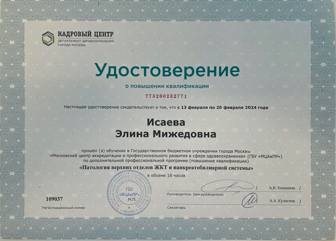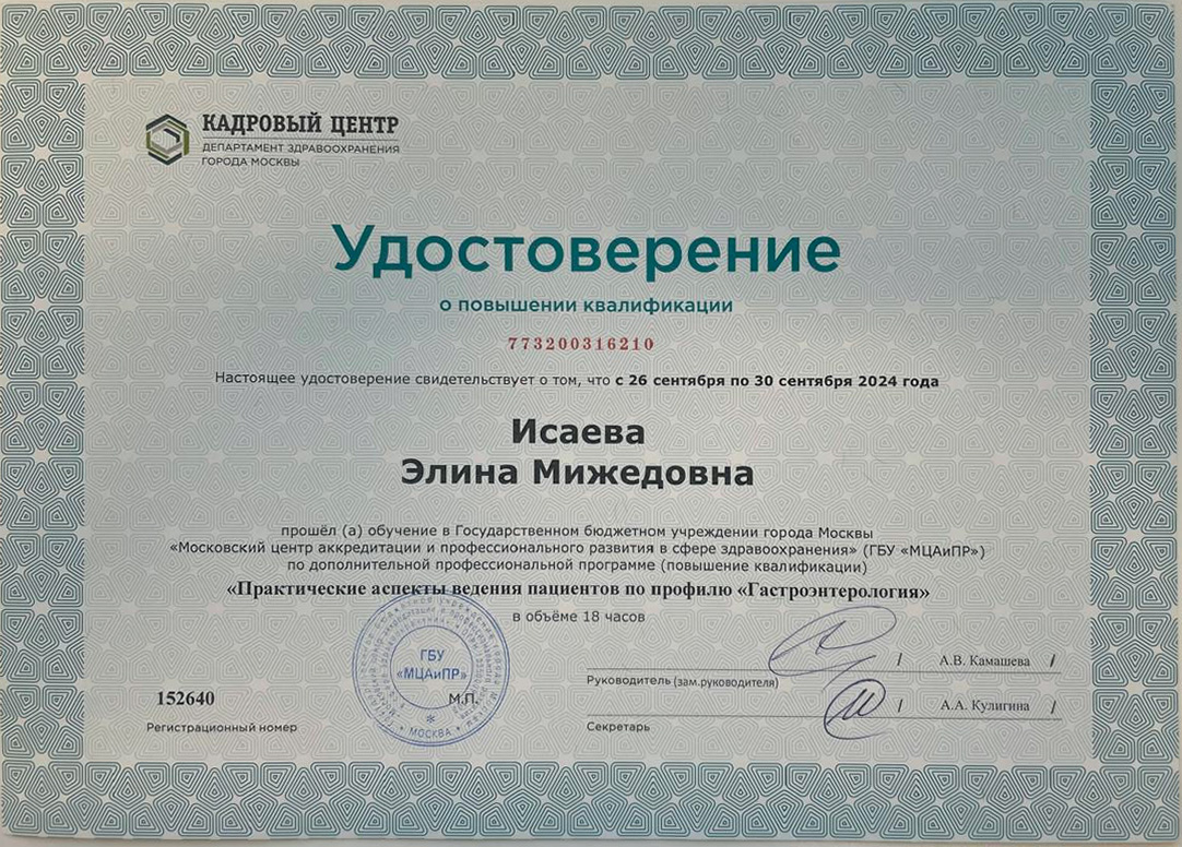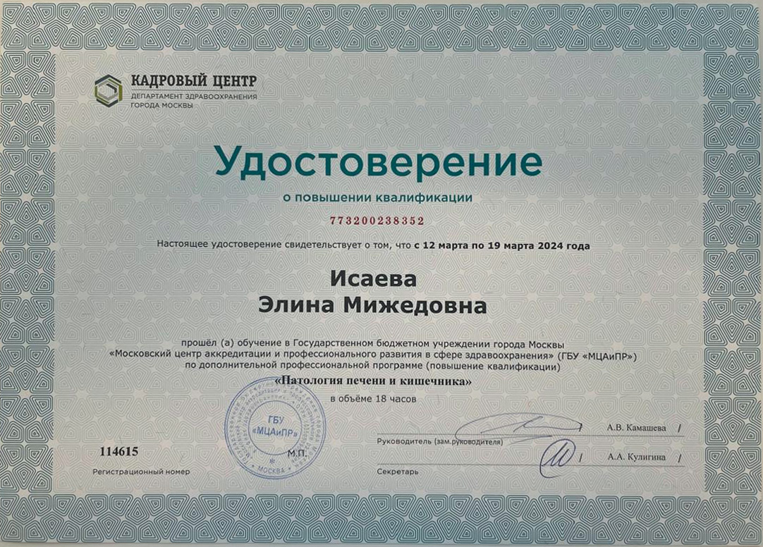- 2004 г. – ГОУ ВПО Московская медицинская академия им. И.М. Сеченова, курс «Диагностика и лечение болезней органов пищеварения»