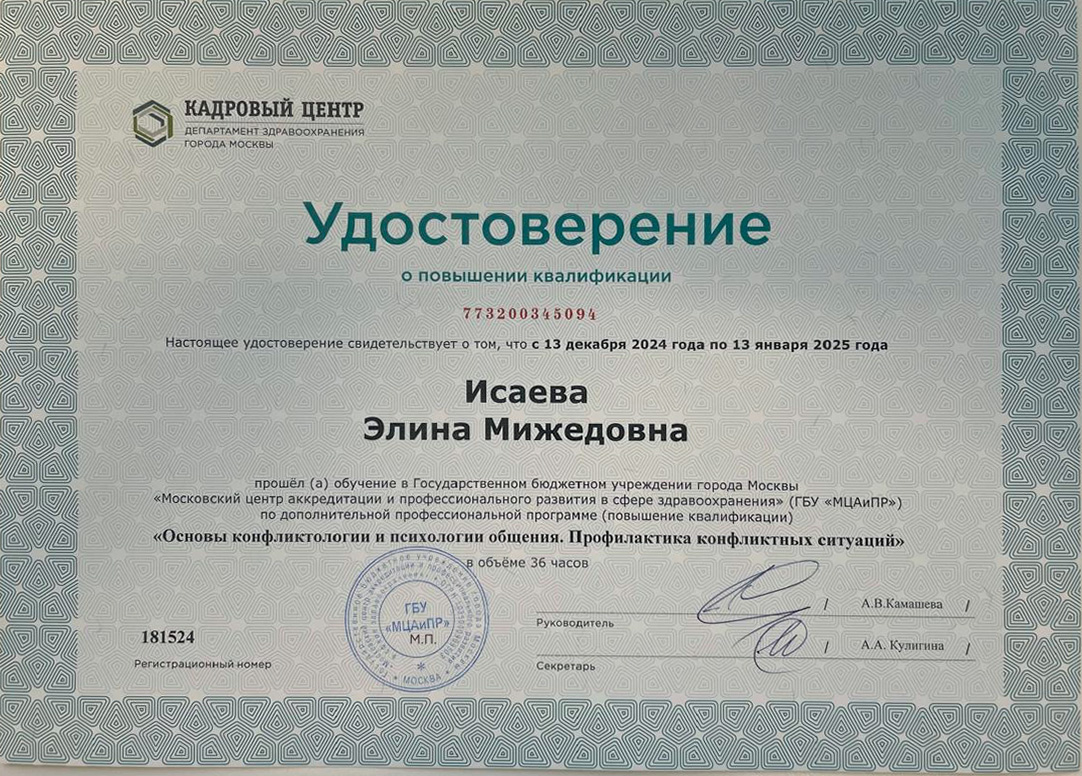 - 2022 г. – Московский Государственный медико-стоматологический университет им. А.И. Евдокимова, повышение квалификации по программе «Фармакотерапия и гастроэнтерология»